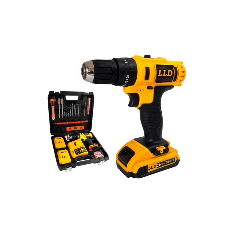 Trapano avvitatore a percussione, dotato di una selezione di ingranaggi con velocità variabile. Ideale per un ampia gamma di applicazioni. Il trapano ha una impugnatura ergonomica, che offre una presa confortevole e un maggiore controllo, riducendo al minimo l'affaticamento e il dolore della mano. Specifiche tecniche: Utilizza batterie da 24V. Variazioni impatti: 25 2 Velocità Chuck: 10mm senza chiave a innesto. Doppia batteria RPM: 2 Velocità (0-400 / 0-1350) Coppia massima: 10-30N.M Contenuto della confezione: Trapano avvitatore Caricabatterie 2 Batterie a litio 16 accessori Valigetta