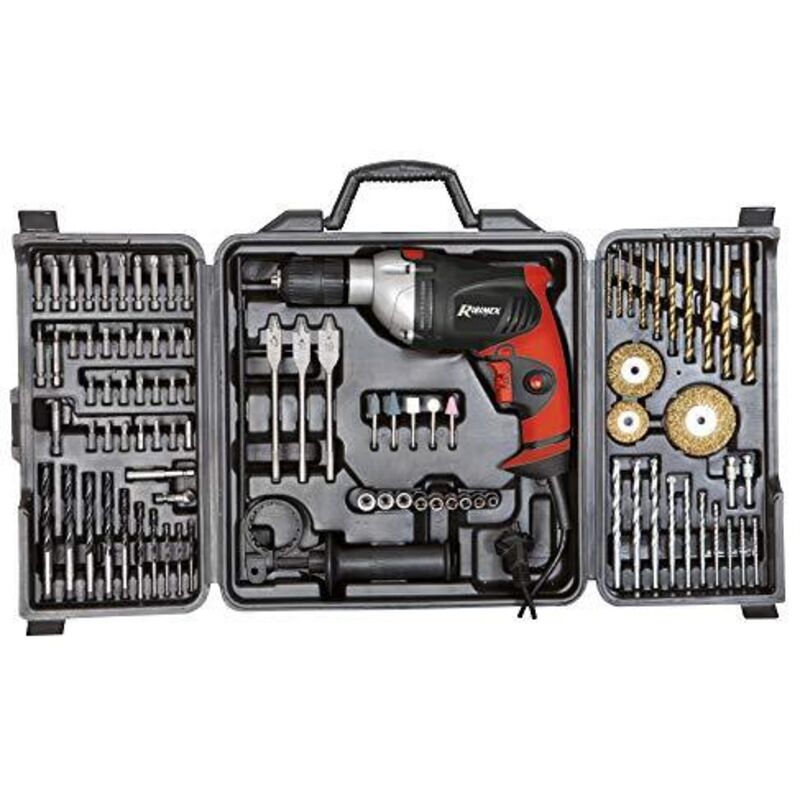 Trapano avvitatore a percussione elettrico con 92 accessori, 810 W - RibimexUn must have per il Fai da te è un trapano avvitatore. Questo è un attrezzo solido e performante che ti permetterà di dare costanza e qualità ai tuoi lavori di casa. Un utensile dotato di un pulsante che permette il funzionamento continuo, un pulsante zigrinato per selezionare le diverse velocità e un interruttore con la possibilità di scegliere la percussione, la foratura oppure l'avvitatura o lo svitamento. Il mandrino autoserrante smontabile agevola lo scambio delle punte con un massimo di 13 mm. Caratteristiche del prodotto Potenza (W) 810 Marca Ribimex Alimentazione Elettrica Mandrino Autoserrante Potenza (W) 810 Giri a vuoto (g/min) 3200 Dimiensioni prodotto Larghezza: 0.115 m. Altezza: 0.35 m. Profondit: 38.5 cm. Peso: 4.1 Kg. Dimensioni Imballo Larghezza: 0.0 cm.