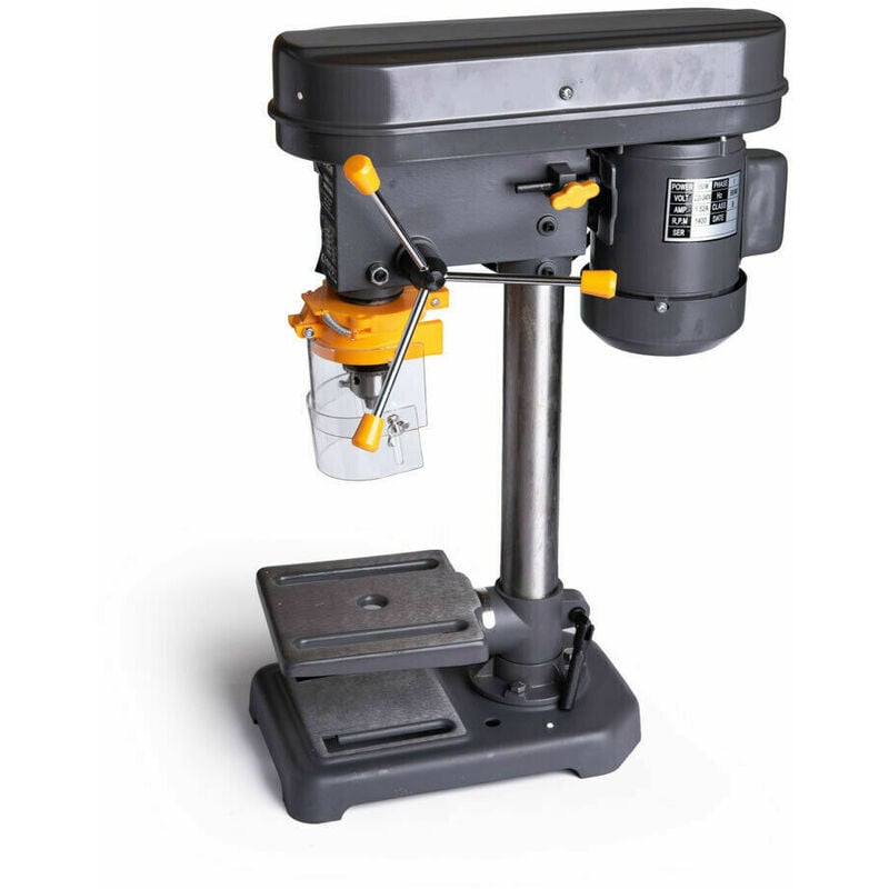 Trapano a colonna da banco. Specifiche Potenza: 350W Alimentazione: 220 - 240V 50/60Hz Velocità: 580-2650RPM Mandrino a cremagliera 13mm Passo mandrino: 50mm Cono mandrino B16 Tavola inclinabile Dimensioni tavolo: 160 x 160mm Dimensioni base: 314 x 200mm Dimensioni macchina: 580 x 430 x 240mm circa Peso: circa 15KG Nota bene. Richiede montaggio