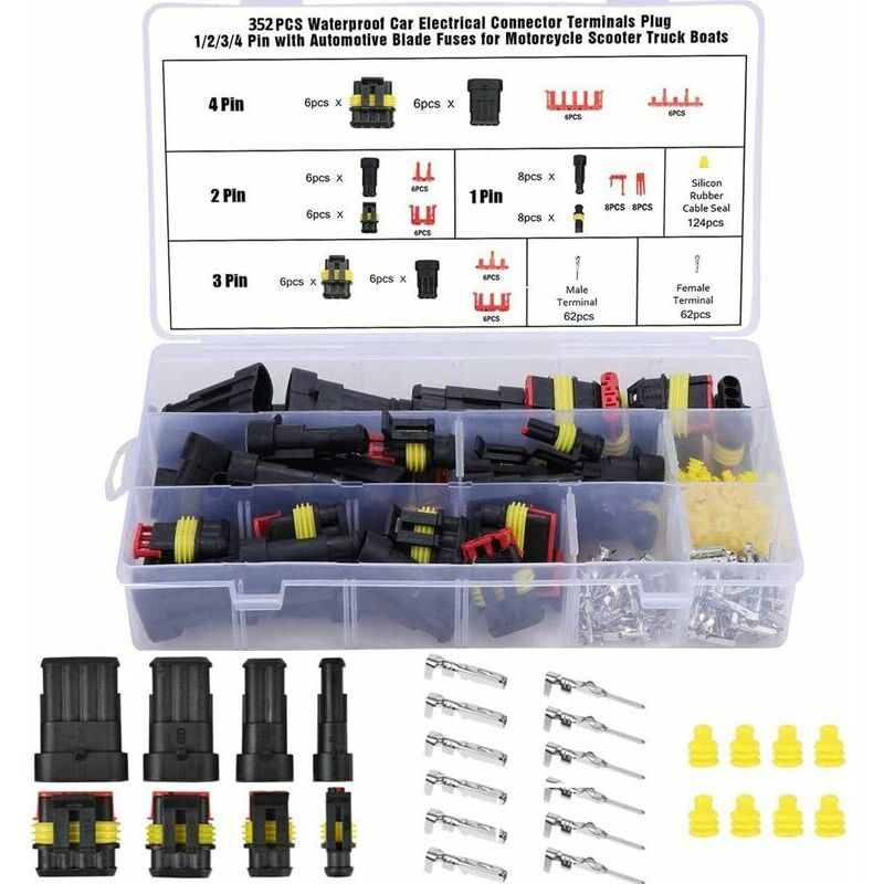 Kit completo da 352 pezzi - Un set di connettori elettrici impermeabili super sigillati a 1, 2, 3 e 4 pin con cappucci e pin del connettore., facili da saldare e installare sotto crimpatura, i fusibili colorati sono facili da identificare e proteggere la tua auto e le apparecchiature elettriche da cortocircuiti e sovraccarichi., [Qualità eccellente] Realizzato con materiali ecologici di alta qualità, ha un'elevata stabilità chimica, conduttività e ossidazione L'impianto elettrico ha requisiti affermativi per le prestazioni di rilevamento impermeabile e antipolvere. [Facile da installare] Il design della fibbia assicura che il contatto sia inserito in modo preciso e completo nell'alloggiamento e impedisce che scivoli fuori dal connettore. Se necessario, può anche essere facilmente rimosso. [Multiuso] Adatto a vari connettori di cavi di moto, scooter, automobili, camion, veicoli a quattro ruote, roulotte, navi, motoscafi e navi.