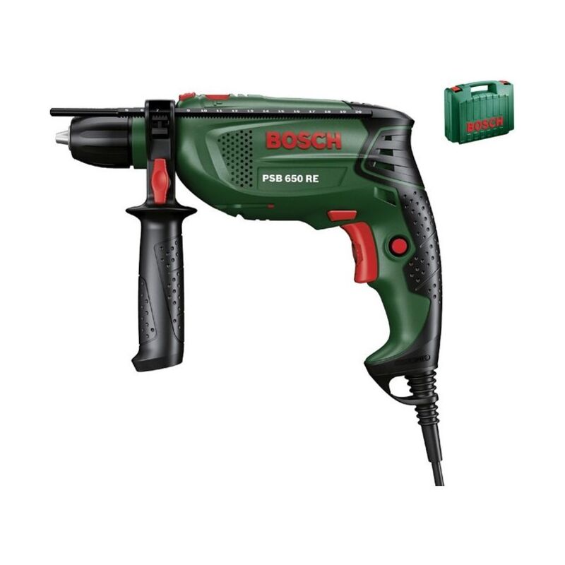 Codice: LF-43408 Marca: BOSCH. ''Bosch trapano PSB 650 RE. Battente e con mandrino autoserrante. Potenza 650 W. Diametro di foratura: calcestruzzo Mm 14, acciaio Mm 12, legno Mm 30. Coppia max 9 Nm, preselezione nr. di giri 50-3000 g/min, 48000 c.pi/min. SoftGrip, predisposizione Sistema Microfilter. In dotazione: impugnatura supplementare, asta di profondita'''', valigetta.''