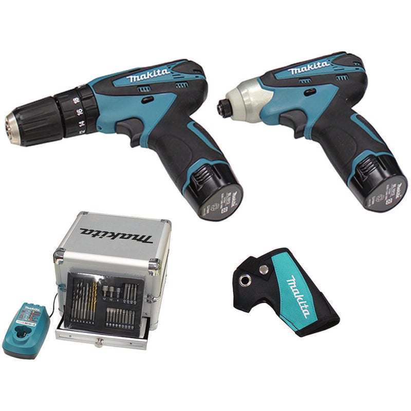 HP330D: trapano avvitatore ad impulsi 2 velocità a vuoto 0-1500/0-400 g/m, colpi al minuto 0-22500/0-6000 c/min, capacità del mandrino mm.10, coppia massima di serraggio 24 Nm con 18 regolazioni + TD090: trapano avvitatore a percussione velocità a vuoto 0-2400 g/m, colpi al minuto 0-3000 c/min, coppia massima di serraggio 90 Nm, attacco 1/4 esagonale - in dotazione: 1 caricabatterie (DC10WA) e 2 batterie (BL1013) - in valigetta in alluminio e pratico set di accessori