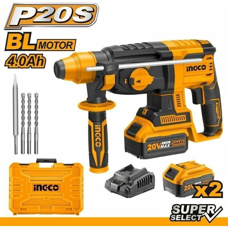 Tensione: 20V Motore brushless (senza spazzole) Velocità a vuoto: 0-1100 Fraquenza dpatto_ 0-5000 bpm Blocco rotazione per solo scalpellatura Potenza colpo: 2 J Attacco: SDS-Plus Capacità massima di foratura: ø 22mm su calcestruzzo Luce Led integrato Sistema mandrino: SDS plus n. 3 punte n. 1 scalpello n. 2 batteria 20V - 4Ah n. 1 caricabatterie PERFORMANCE: con batteria da 2AH è possibile effettuare 8 fori con diametro 10mm e profondità 10cm in blocchi di cemento con batteria da 4AH è possibile effettuare 21 fori con diametro 10mm e profondità 10cm in blocchi di cemento