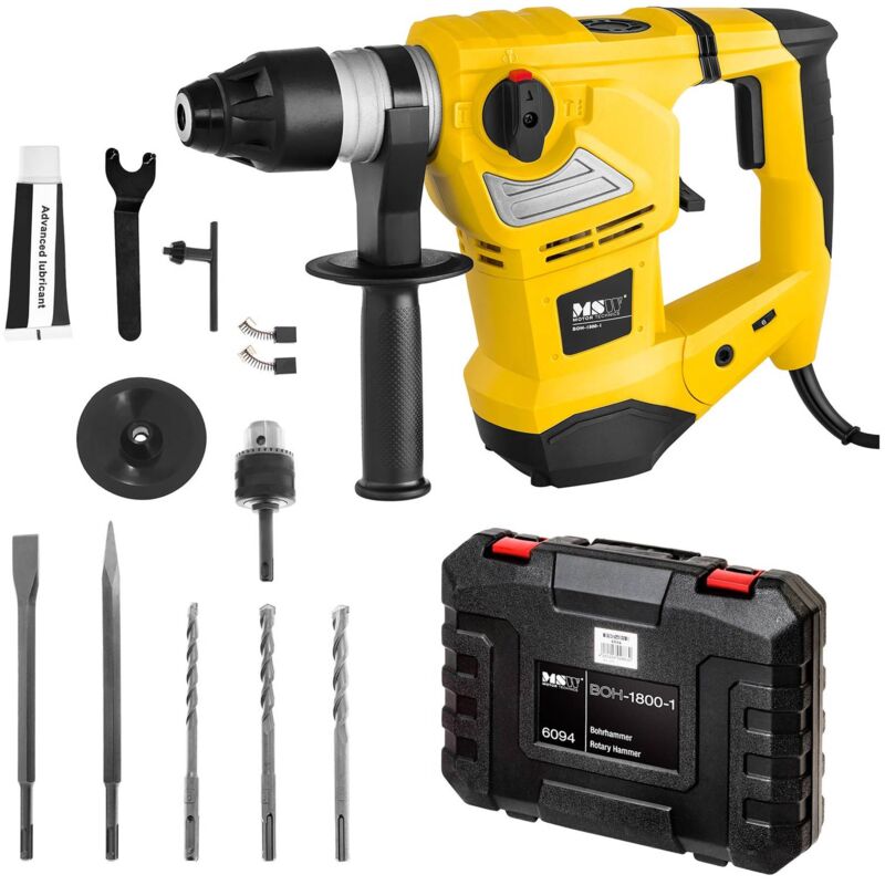 mentre il tasto di arresto ne interrompe il movimento rotatorio. Il sistema SDS-Plus permette di sostituire rapidamente gli accessori, ed è compatibile con scalpelli o punte da trapano con diametro 10 mm e lunghezza massima 250 mm. Inoltre, la sua impugnatura ergonomica vi permetterà di eseguire i vostri lavori in maniera del tutto rapida e agevole. Informazioni sul martello perforatore BOH-1800-1 del marchio MSW