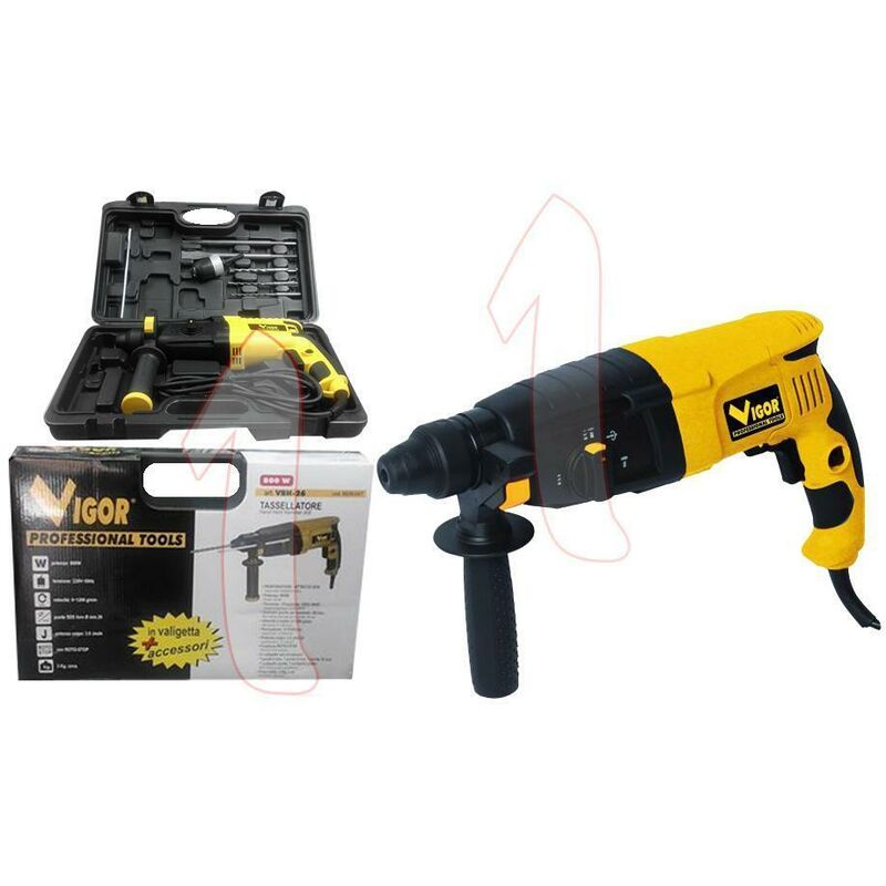 Modello vbh-26 potenza 800 watt tensione 220/240 volt 50 hz diametro foro max 26 mm velocita' a vuoto 900 giri al minuto percussioni 4000 al minuto potenza colpo 3,0 joule funzione roto-stop di serie accessori in dotazione 1 punta d.6- 1 d.8 - 1 d.10 - 1 scalpello - 1 punta peso 3 kg 1 mandrino in dotazione attacco sds plus