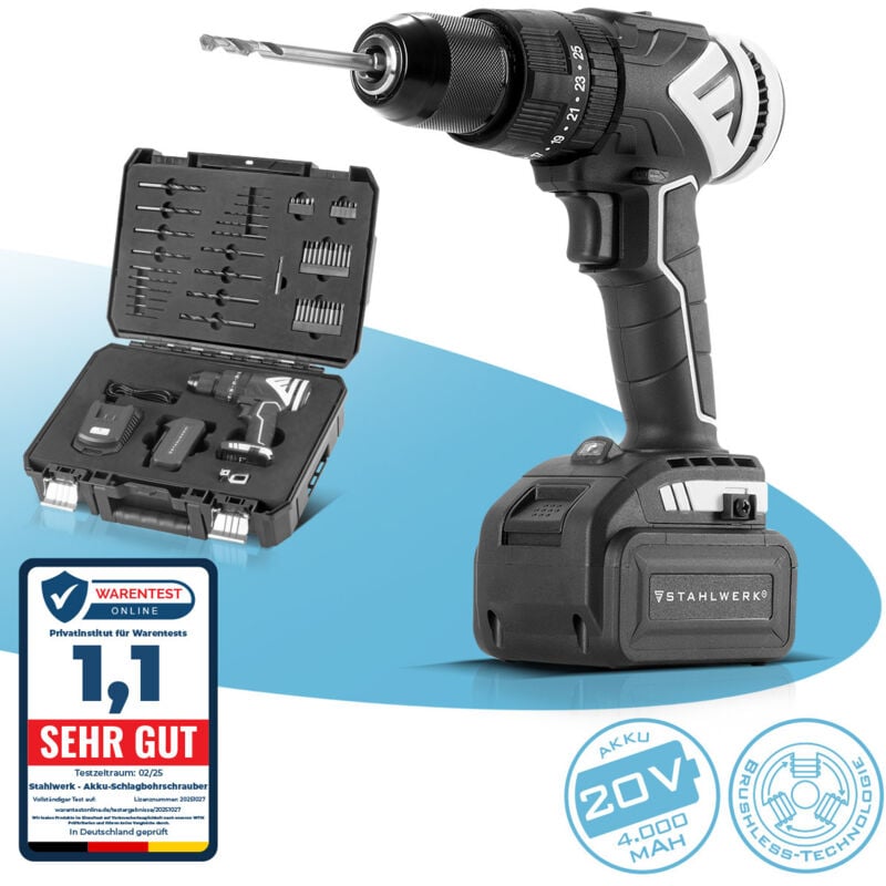 Caratteristiche Il trapano avvitatore a percussione a batteria STAHLWERK ASB-20 ST con sistema da 20 volt promette la massima potenza per sessioni di lavoro molto lunghe. Con una coppia di 60 Nm, il potente avvitatore a batteria è ideale per allentare e stringere rapidamente le viti e ha anche una potente funzione di foratura a percussione. Dotato di tecnologia brushless di ultima generazione, il trapano avvitatore a batteria lavora praticamente senza usura, raggiunge un elevato livello di efficienza e garantisce una durata estremamente lunga. L'assenza di spazzole di carbone evita l'abrasione, assicura un basso sviluppo di calore e un consumo energetico ridotto. L'avvitatore a impulsi a batteria è dotato di un potente cambio a 2 velocità con freno motore integrato, una regolazione separata della coppia a 25 livelli e un mandrino in metallo di alta qualità. L'avvitatore a batteria è inoltre dotato di una pratica luce a LED per illuminare l'area di lavoro. Caratteristiche tecniche
