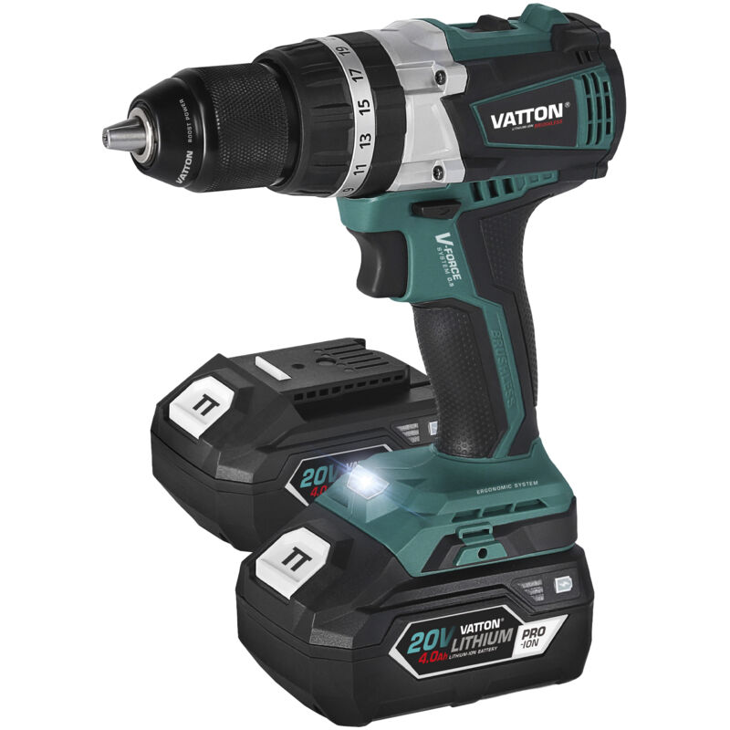 Trapano a percussione con mandrino in metallo da 13 mm. 21 posizioni di serraggio con martello/avvitatore/trapano. Selettore con cambio del senso di rotazione. li> Motore BRUSHLESS, funzionamento brushless. Batteria al litio PRO-ION da 4000 mAh, inclusa. Due velocità di lavoro: 0-650/0-2350 RPM. Forza di coppia di 65 Nm e 34.000 colpi al minuto. Grillo a velocità variabile e sistema antiriscaldamento. Trapano a percussione con luce LED per aree di lavoro buie . Include caricabatterie a ricarica rapida e due batterie da 4,0 Ah.