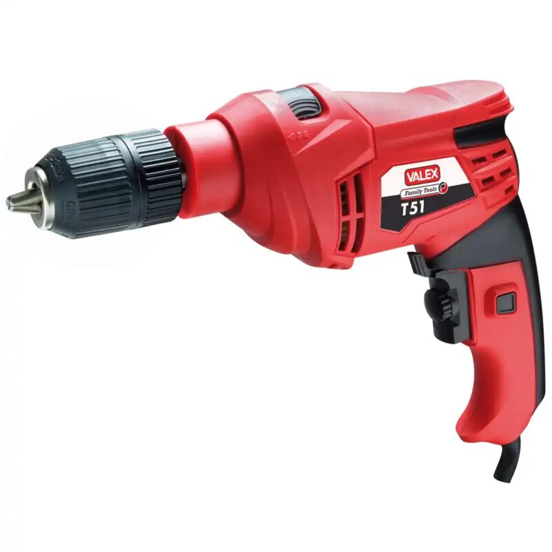 Trapano a percussione con regolazione elettronica della velocità di rotazione, reversibile, mandrino autoserrante e pulsante per funzionamento continuo. Apertura mandrino: 2 - 13 mm. Percussione 48000 colpi al minuto. Potenza: 500 Watt Velocità di rotazione: da 0 a 3000 giri/min - Percussioni al minuto: 48000 Capacità di foratura legno: 20 mm Capacità di foratura metallo: 10 mm Capacità di foratura muratura: 13 mm
