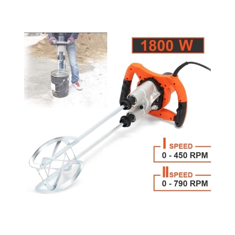 Trapano impastatore professionale con doppia elica di ottima qualit� ideale per malte e vernici e per mescolare materiali liquidi e polveri da costruzione. La regolazione della velocit� permette un adattamento ottimale del funzionamento alla consistenza del materiale che si vuole mescolare. La doppia asta agitatrice, permette una maggiore efficacia nella lavorazione del materiale e assicura quindi risultati eccellenti. - Potente motore da 1800W - Doppi marcia - Regolazione elettronica di velocit� su 6 posizioni - Alimentazione (V/Hz): 230/50 - Potenza (W): 1800 - Velocitᄄᄂ low (rpm): 0-450 - Velocitᄄᄂ high (rpm): 0-790 - Diametro eliche (mm): 100 - Altezza eliche (mm): 190 - Altezza asta agitatrice compreso elica (mm): 580 - Dimensioni imballaggio LxPxA (mm): 600x335x250 - Peso (Kg). 7,2