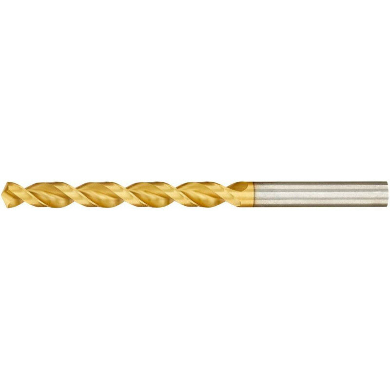Punta a spirale. gambo cilindrico. HSS-E PM. DIN 338. Tipo GT 500 DZ Disegno: Superficie rivestita in TiN. taglio destrorso. con affilatura speciale e punta a rapporto. Angolo di spoglia laterale normale. Spessore del nucleo superiore al normale e senza rialzo del nucleo. La punta ha un ottimo comportamento autocentrante e produce trucioli corti anche nei materiali a lungo taglio. Modello stabile e robusto. profilo rettificato. taglio destrorso. con affilatura precisa della punta e una speciale puntatura e una notevole resistenza alla durezza a caldo. Aumento del nucleo normale. Applicazioni: Utilizzabile per profondità di foratura fino a 5 x D. Adatta per acciai strutturali e al carbonio. Acciai altamente legati. Acciai per utensili. Ghisa e leghe fuse. Leghe di magnesio. Metalli non ferrosi. Plastiche.