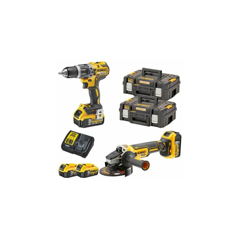 DEWALT DCK2153P2T kit 18v avvitatore dcd796p2 smerigliatrice dcg405nt 2x5ah 2tstak DCK2153P2T Kit 18v composto da: DCD796 Trapano a percussione DCG405 Smerigliatrice 125mm 2 Batterie XR 18V 5.0AH Caricabatterie rapido 2 Valigette TSTAK DCD796P2 Avvitatore a percussione 18v Caratteristiche Trapano Avvitatore con percussione 18V XR Litio con batteria da 5.0Ah La nuova generazione di avvitatori con percussione dotati di batterie al Litio da 5.0Ah Due velocità garantite da un sistema ad ingranaggi completamente in metallo 15 punti di regolazione della coppia per un corretto settaggio in ogni applicazione possibilità di utilizzare la percussione per foratura in muratura Sistema elettronico intelligente per il monitoraggio costante dell‘utensile della batteria: una vera centralina Dotato di mandrino autoserrante da 13mm completamente in metallo Impugnatura completamente in gomma per una presa corretta dell‘utensile ed un confort eccezionale Le nuove batterie al Litio garantiscono