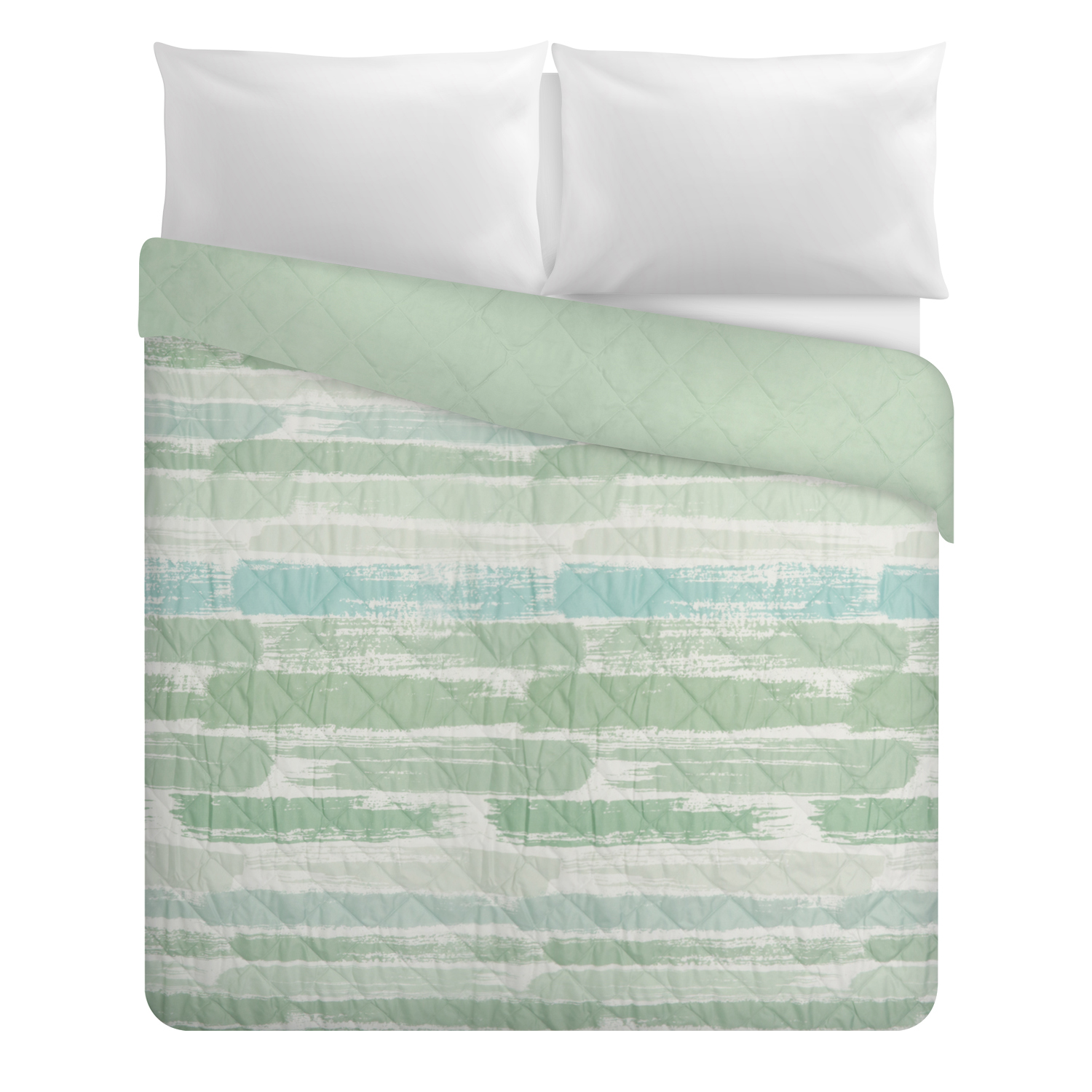 Completa la tua camera da letto con i delicati toni pastello di questo trapuntino double face. A seconda dei tuoi gusti, potrai posizionarlo sia dal lato tinta unita verde che dal lato con decori che ricordano le armoniose pennellate di un pittore. Leggero e morbido sulla pelle, è pensato per vestire il tuo letto in primavera e in estate. Il tessuto in poliestere ha una grammatura di 75 g/mq e una leggera imbottitura di 60 g/mq. Puoi lavarlo in lavatrice a 30° con centrifuga bassa. Si consiglia di asciugarlo all'aria aperta, evitando quindi l'asciugatura in tamburo. Copriletto matrimoniale con misura 250x250 cm.