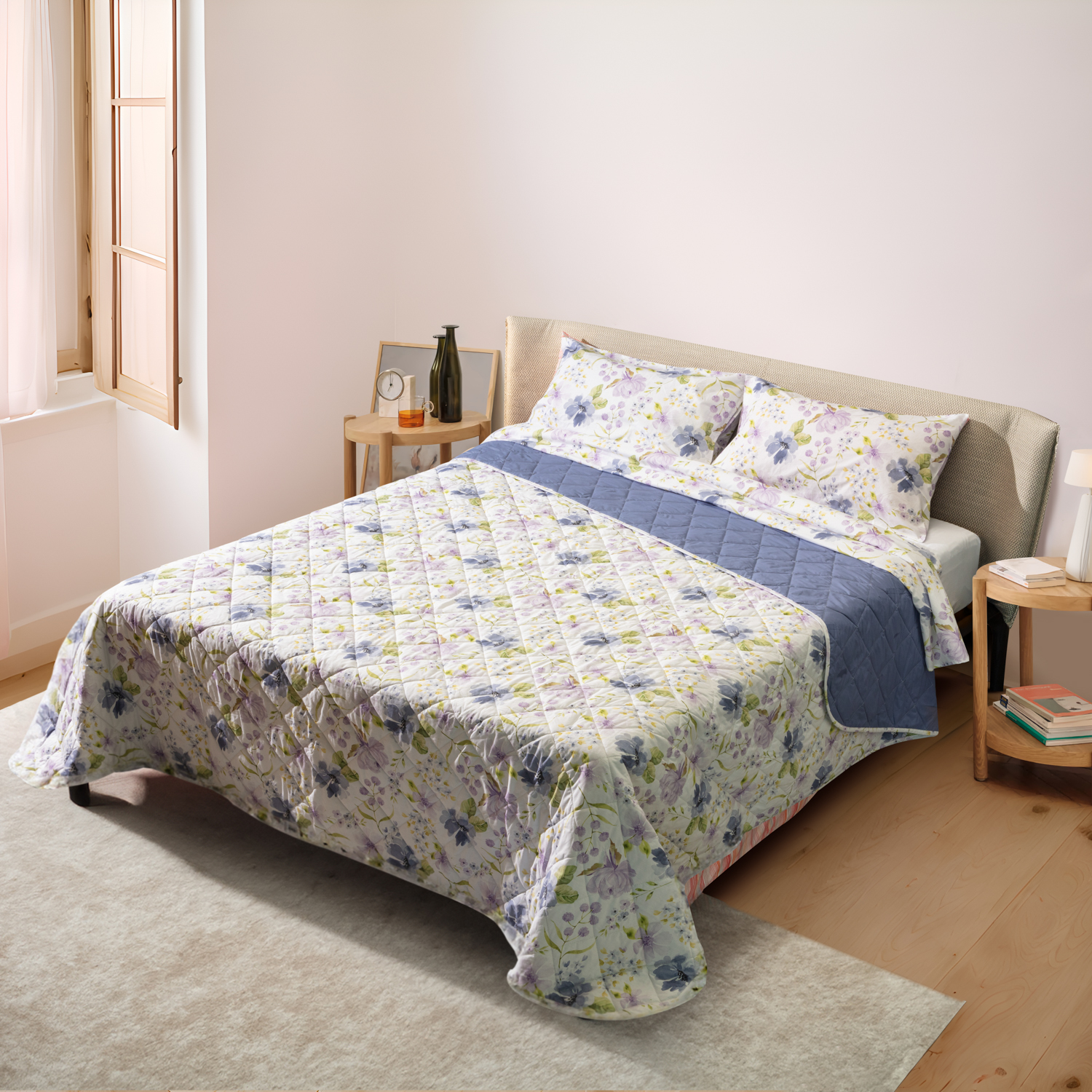 Il trapuntino in cotone percalle è la scelta di qualità per riposare bene e avvolgerti in un tessuto morbido e fresco. Il delicato decoro a fiori blu e lilla porta una ventata di primavera in qualsiasi camera da letto. Crea il tuo set tessile letto personalizzato abbinandolo alle lenzuola della linea. Lavabile in lavatrice a 30°, con misura 260x260 cm.