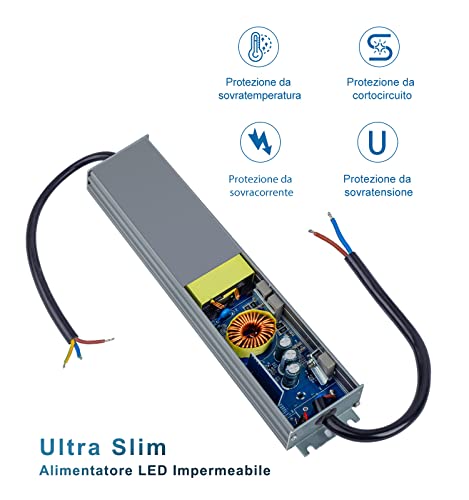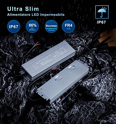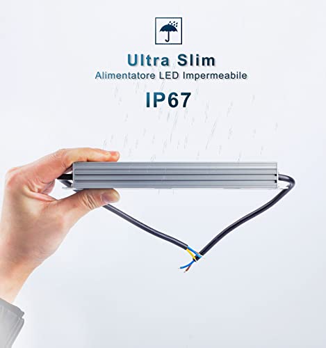 【Protezione】 Driver LED impermeabile certificato IP67. Per lampade a LED a bassa tensione 12Vdc. L'affidabile circuito interno fornisce funzioni di protezione da sovratensione, sovratemperatura, sovracorrente e cortocircuito.