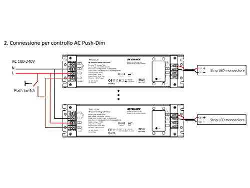 Trasformatore Alimentatore Dimmerabile, 24V 150W, Dimmerabile Con Pulsante N.O. Push Dimmer e Telecomando RF 2.4G, Per Striscia Led 24V, Skydance PH-150-24