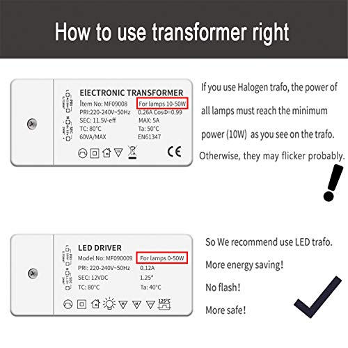 ★ Led spot AC/DC 12 V: Verwenden Sie einen passende LED Trafo besser. Falls Sie einen Halogen Trafo anschließen wollen, beachten Sie bitte, dass die gesamte Walle dieser LED Lampe die niederigste Leistung Ihrer angeschlossenen Trafos erreichen kann. Sonst flackern die Lampen stark
