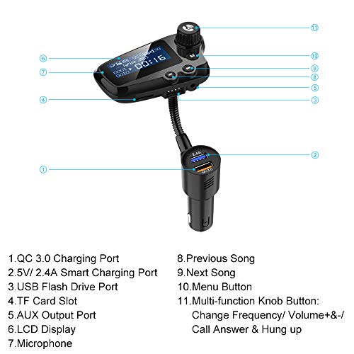 Smart QC3.0: Il trasmettitore FM dispone di una porta di ricarica QC3.0 per una ricarica rapida e una velocità di ricarica fino a 4 volte più veloce rispetto ai caricabatterie standard. Un'altra porta di ricarica USB funge da porta di ricarica o porta U disco per la riproduzione musicale.