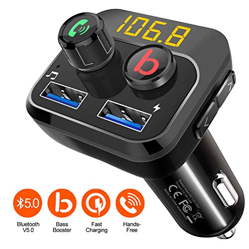 Trasmettitore FM, V 5.0 Bluetooth trasmettitore FM per auto MP3 Bluetooth Music Player kit vivavoce auto con Bass Booster, due porte USB 5V / 3.4A, Play scheda TF/USB Flash Drive