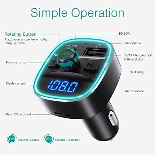 Trasmettitore FM Bluetooth 5.3, ORIA Trasmettitore Radio Wireless per Auto, Caricabatterie Rapido PD Tipo C 3.0, Chiamate in Vivavoce, Riproduzione Musicale Supporta Scheda TF, Disco USB