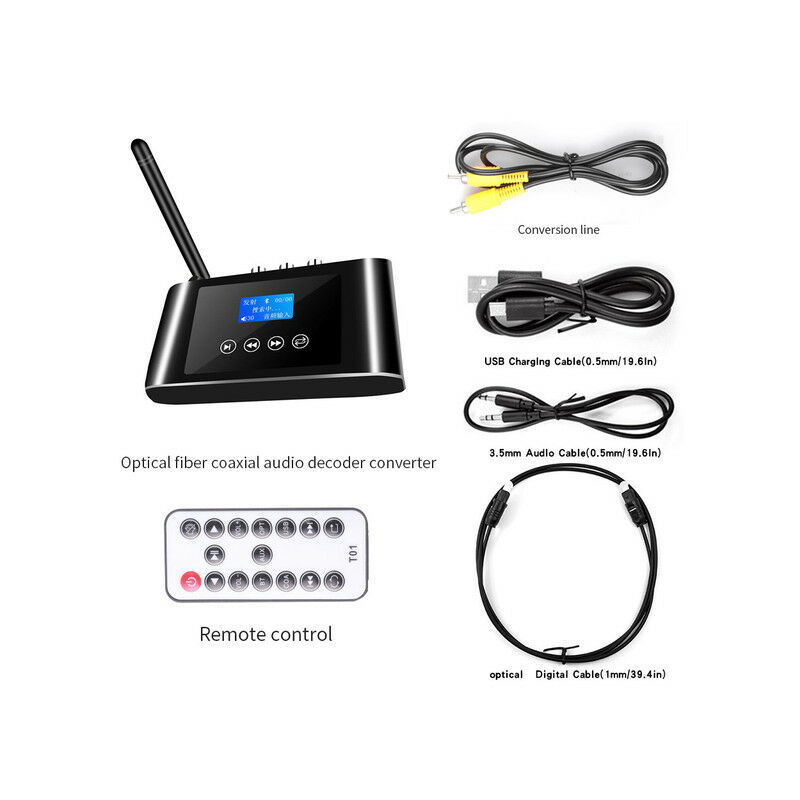 NOME DEL PRODOTTO:BLUETOOTH RICEVERE TRASMISSIONE DIGITALE CONVERTITORE AUDIOMODELLO DEL PRODOTTO:T38MATERIALE DEL PRODOTTO:IN LEGA di ALLUMINIOCOLORE DEL PRODOTTO:NEROVERSIONE di BLUETOOTH:BLUETOOTH5.1INGRESSO:FIBRA/COASSIALE/AUXCOMPATIBILE:Bluetooth 5.1 192KhzUSCITA:RCA (R/L) /AUXDISTANZA di TRASMISSIONE:15mPARTI:Linea RCA * 1, linea a fibra ottica * 1 linea coassiale * 1 linea aux * 1 linea di alimentazione * 1