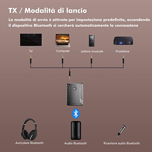 Modalità ricevitore trasmettitore: design 2 in 1 con questo adattatore WiFi, puoi inviare e ricevere tutti i dati audio liberamente e facilmente.In modalità trasmettitore, TV, PC, laptop e altre sorgenti audio domestiche possono trasmettere la musica dei dispositivi alle cuffie Bluetooth o altoparlanti.In modalità di ricezione, il Bluetooth del tuo stereo di casa è attivato per ricevere musica in streaming wireless dal tuo telefono e tablet.Un clic.- Passa a un'altra modalità Semplice e comodo.