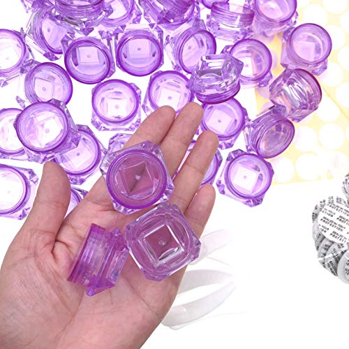 Confezione contiene: 40 x a forma di diamante viola trasparenti 3 ml contenitori per campioncini cosmetici con coperchi in plastica + 10 x mini spatola + 140 x adesivi rotondi bianchi + 40 x sigilli.