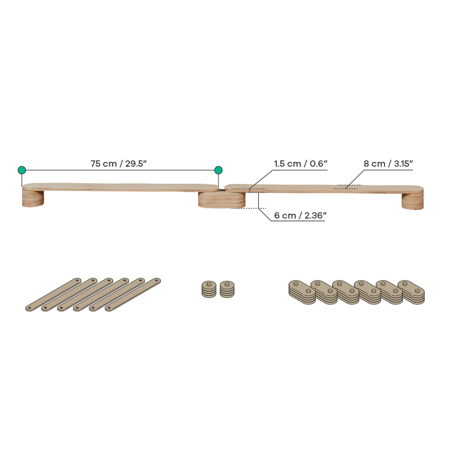 Dettagli del prodotto: Età: da 3 anni L'equilibrio è divertente - e molto di più! migliora l'equilibrio allena la coordinazione migliora la concentrazione crea una comprensione della gravità rafforza la fiducia in se stessi fornisce stimoli sensoriali esercita la stabilità e i tempi di reazione rafforza i muscoli Facile da montare e da riporre Dimensioni e peso: Trave di equilibrio in legno: Larghezza: 8 cm Lunghezza: 75 cm Spessore: 1,5 cm Altezza dal pavimento: 6 cm Lunghezza: 4 travi: 306 cm Materiale e cura: Realizzato in compensato di betulla di provenienza sostenibile.