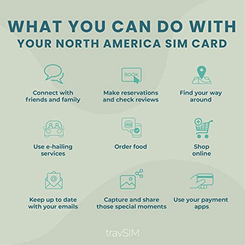 TravSIM Prepaid North America SIM Card | 50GB di dati mobili a velocità 5G. Questa carta SIM utilizza la rete AT&T e funziona negli Stati Uniti, in Canada e in Messico. Valida per 60 giorni