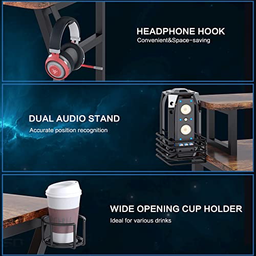 TREETALK Scrivania da gioco, scrivania per computer, con grande supporto per monitor e ripiano aperto, gancio per cuffie, 2 supporti per altoparlanti per casa e ufficio (marrone scuro)