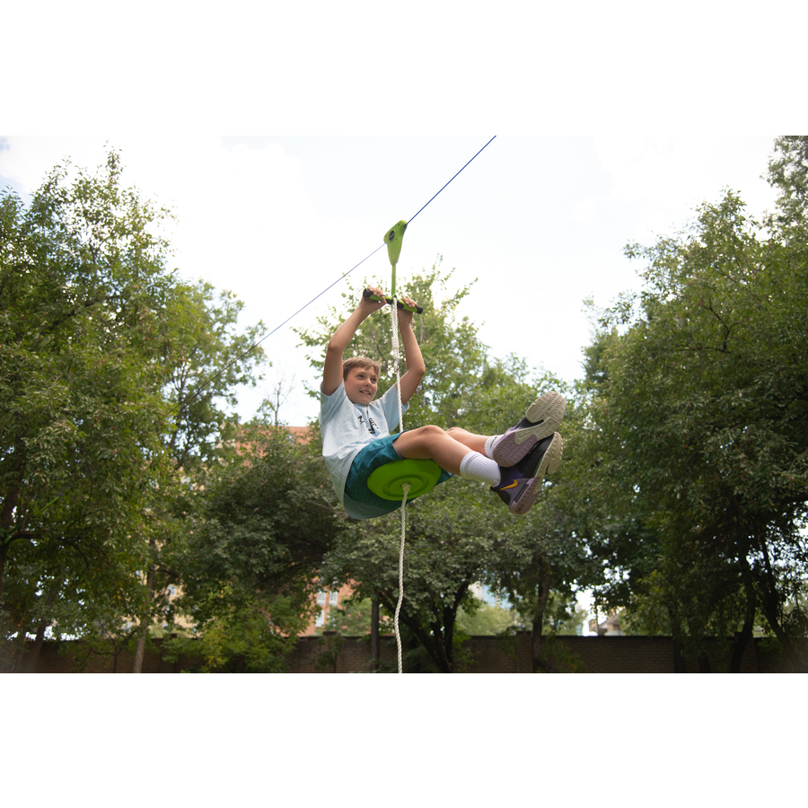 Dettagli del prodotto: Età: da 3 anni La maniglia di guida si trova a 30 cm sotto il cavo d'acciaio, per proteggere i bambini dal rischio di ferirsi le dita. Sedile soffiato rinforzato e cavo con corda in PE intrecciata e regolabile La fornitura comprende 1 x 30 m di cavo d'acciaio zincato a caldo con protezione per gli alberi SAFETY 1 x carrello 1 x sedile 1 x corda in PE 1 x freno a molla