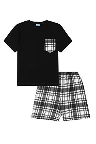Pigiama corto in cotone per ragazzi, colori deliziosi con tasca a quadretti sul petto Maglietta corta nera stile con pantaloncini elasticizzati in coordinato a quadri neri Pjs.