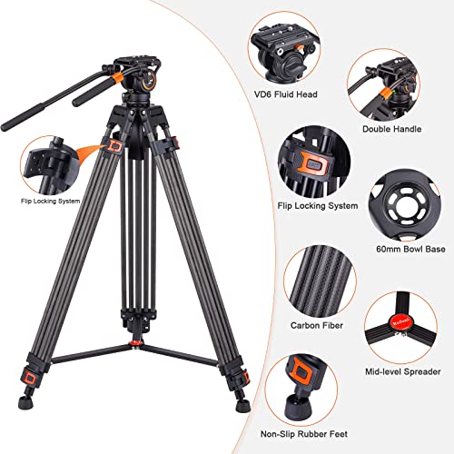 【Treppiede Video】: Il treppiede video include un treppiede in carbonio a 2 stadi leggero con una ciotola da 60 mm e una testa fluida compatta con un carico utile di 6 kg.