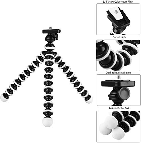 Multiuso: compatibili con telefoni, fotocamere e fotocamere compatte: questo treppiede flessibile a 360 consente di piegarlo in molte angolazioni, puoi divertirti se avvolgi le gambe intorno a rami, pali, pali, ecc. La base del piede può afferrare la maggior parte delle superfici ferme