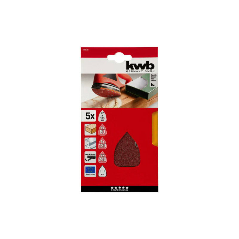 Presentazione: La confezione di 5 triangoli abrasivi KWB di forma speciale - 136 x 96 mm - 93 mm - grana 80-120-240 vi permetterà di avere sempre un abrasivo a portata di mano quando utilizzate la vostra levigatrice triangolare o a delta. Questi pad hanno un supporto in velluto autoaderente e possono essere utilizzati su un'ampia gamma di superfici. È possibile lavorare su metallo, legno, stucco, pietra, plastica, vernice e lacca. Questi abrasivi hanno una forma particolare rispetto ai triangoli tradizionali. Vantaggi: Adatti per lavorare su legno, metallo, stucco, pietra, plastica, vernice e lacca. Corindone di qualità raffinato con ossido di alluminio Confezione contenente: 2 grane da 80, 1 grana da 120 e 1 grana da 240 Caratteristiche: Diametro: 93 mm Dimensioni: 136 x 96 mm Grana: 80 - 120 - 240 Peso: 43 g Rif. 493600 Confezione: Confezione da 5 triangoli abrasivi KWB di forma speciale - 136 x 96 mm - 93 mm - grana 80-120-240Consegnati nella loro confezione originale.