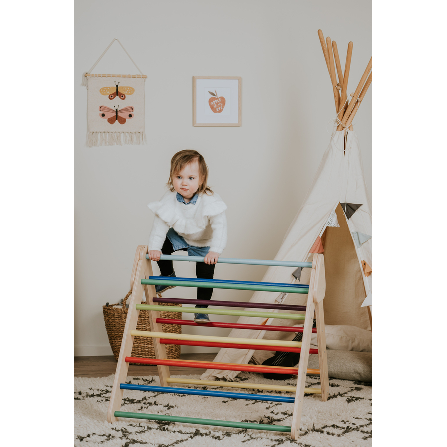 Dettagli del prodotto: Età: da 6 mesi Il triangolo di arrampicata è un parco giochi per bambini unico nel suo genere tiger Anche i bambini usano le barre di legno del Triangolo di arrampicata per tirarsi su e stare in piedi. Il triangolo di arrampicata offre infinite possibilità di apprendimento e divertimento Sviluppa la destrezza, la gioia del movimento, l'equilibrio e le capacità motorie. Favorisce il coraggio, la salute delle articolazioni, lo sviluppo muscolare e la salute delle ossa. La stimolazione dei piedi è fondamentale perché previene i piedi piatti e migliora la postura per il resto della vita. Non è pieghevole Dimensioni e peso: Dimensioni da assemblato (lunghezza x larghezza x altezza): 86 x 82 x 72 cm. Peso: 7,2 kg Materiale e cura: Realizzato in compensato di betulla certificato FSC di provenienza sostenibile.