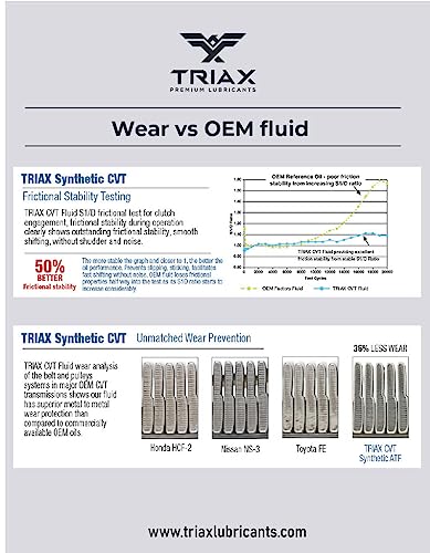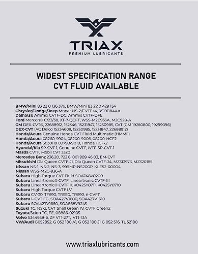 Adatto a tutte le trasmissioni CVT di veicoli giapponesi, tedeschi e statunitensi. Supera la maggior parte dei fluidi OEM per trasmissioni CVT a CATENA e CINGHIA. TRIAX SYNTRON CVT SYNTHETIC è anche raccomandato e compatibile con alcune trasmissioni prodotte da Mercedes, Suzuki, Hyundai, Kia e altri.