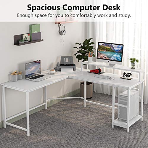 Scrivania per computer con ampio supporto per monitor e ripiano fai da te: lo scaffale salvaspazio della scrivania per computer a forma di L per i monitor lascia molto spazio sulla superficie per tastiera e mouse durante la scrittura, il gioco, il lavoro al computer e altre attività di home office. Questa scrivania angolare per computer è dotata di 2 ripiani (a destra) per tenere a portata di mano i file e i libri. Se hai bisogno di più spazio, puoi rimuovere il ripiano superiore della scrivania per un po 'di spazio extra per una torre del computer.