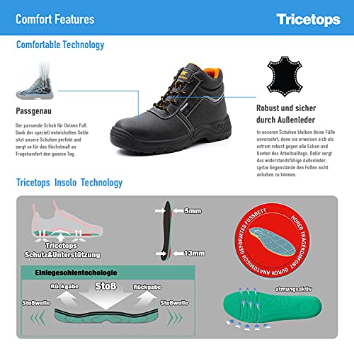 Tricetops Scarpe antinfortunistiche da uomo e donna, punta in acciaio S3 SRC, antiscivolo, resistenti all'usura, impermeabili, traspiranti, comode, antistatiche, leggere, da lavoro, Nero, 42 EU