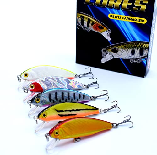 ✅ Versatilità > Questo set di esche da pesca è destinato ai pescatori in fiume, ma può anche essere utilizzato in laghi, serbatoi, laghi. È il più apprezzato della nostra gamma per la trota e la persiana. La confezione contiene 5 pesci nuotatori di 5 cm 3 g in 5 colori diversi. La sua leggerezza permette delle posate molto discrete, ideale per la trota