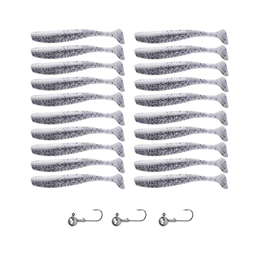 Trifyd ® Fishing - Esche morbide da 7,5 cm per trote e piccoli carnieri, confezione da 20 esche da pesca + 3 teste piombate (bianco glitterato)