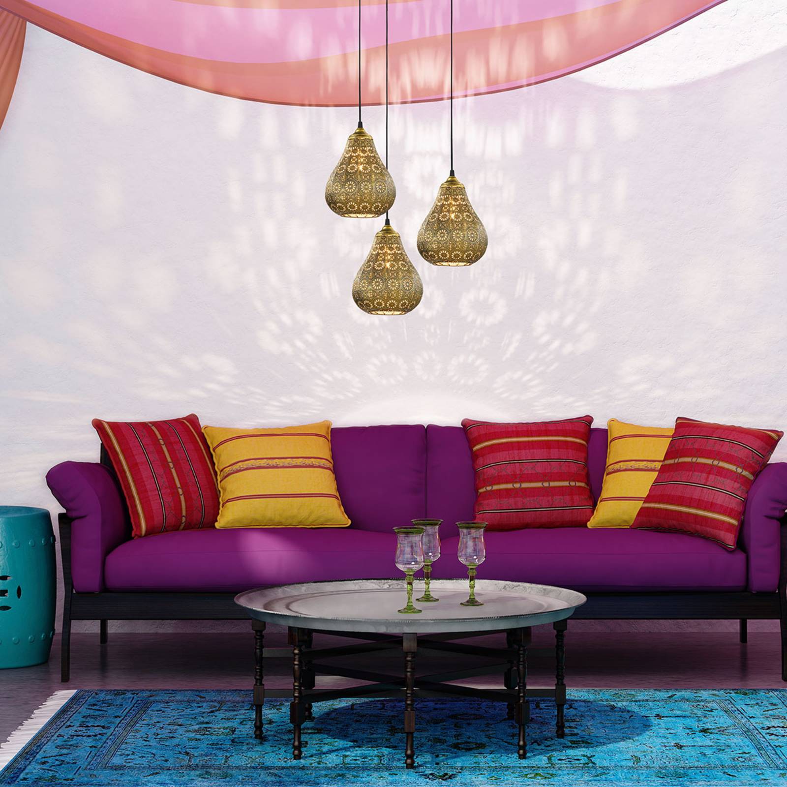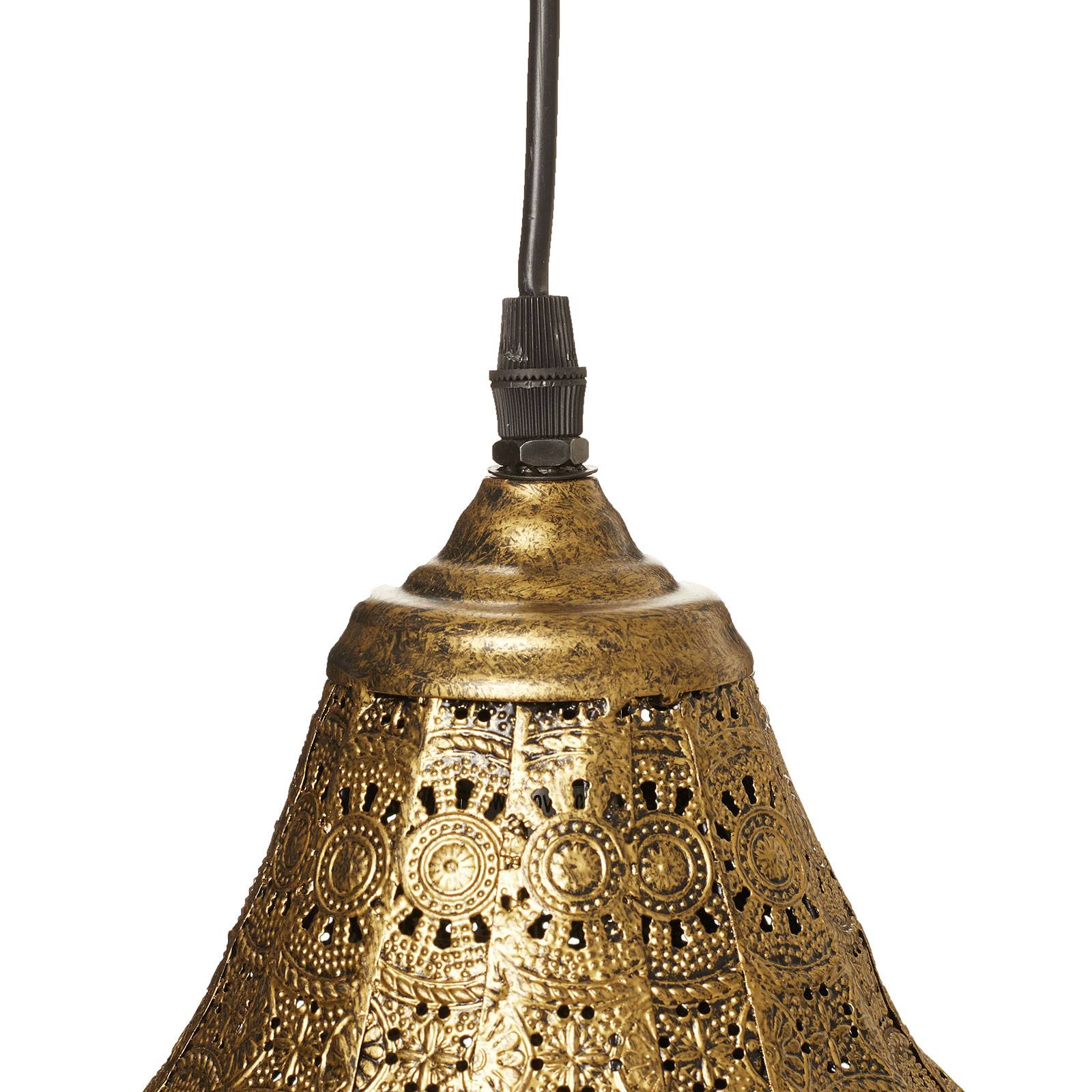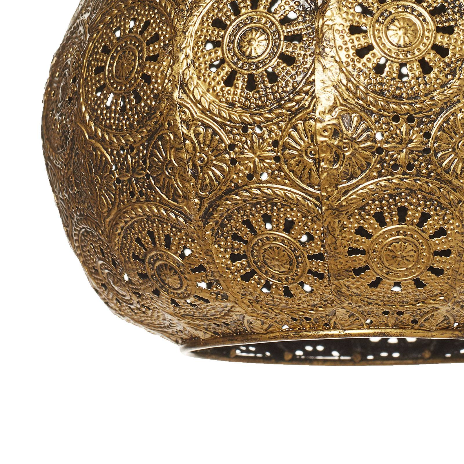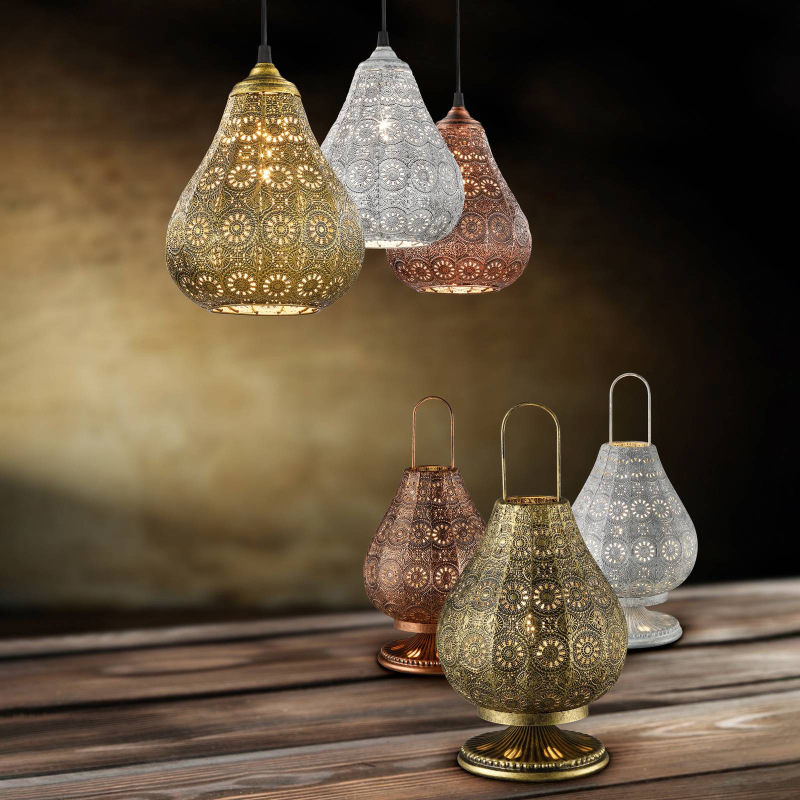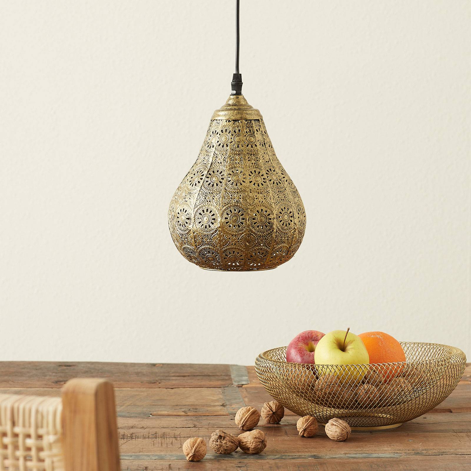 Jasmin - lampada a sospensione di stile orientaleggiante La lampada a sospensione Jasmin porta in casa tutto il fascino dell'Oriente. Il paralume metallico a forma di pera è lavorato con una serie di punzonature che diventano particolarmente suggestive a luce accesa.