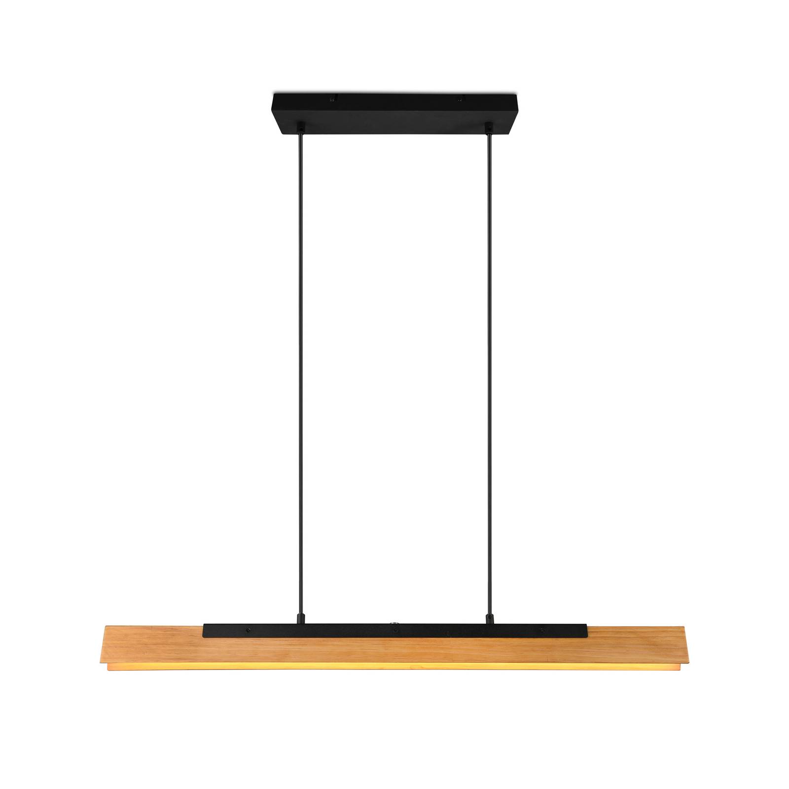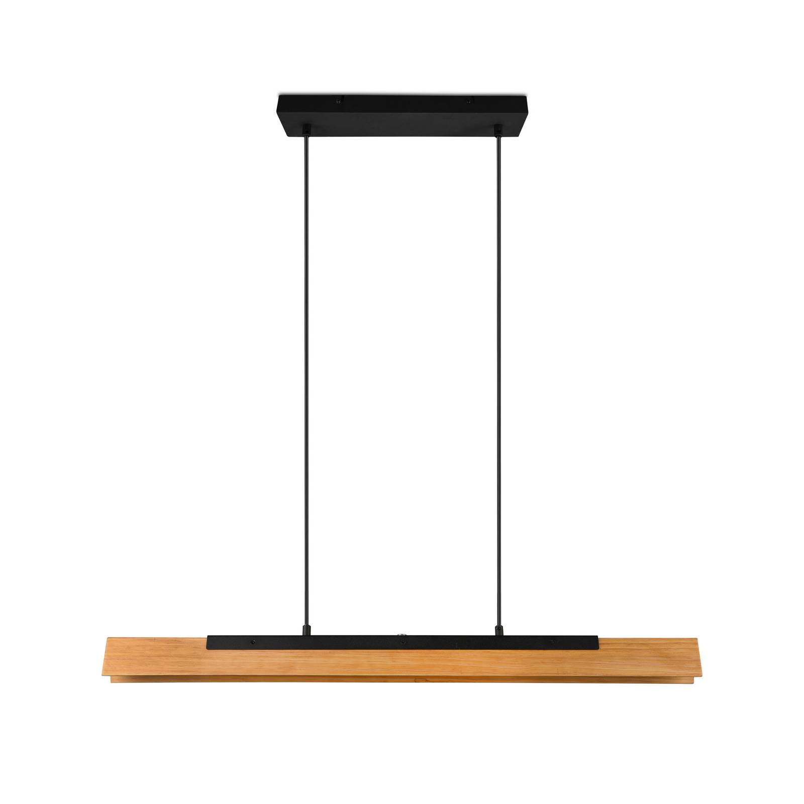 Dimmer a sfioramento integrato: Lampada a sospensione Kerala LED con paralume in legno, bianco caldo La lampada a sospensione Kerala LED è sospesa da un rosone in metallo laccato nero tramite due cavi. I LED SMD che emettono luce bianca calda sono integrati nel paralume in legno chiaro. Tramite un interruttore a sfioramento sulla parte superiore del paralume, Kerala può essere non solo accesa e spenta, ma anche dimmerata in 3 livelli (100% / 50% / 25%) grazie al dimmer integrato.
