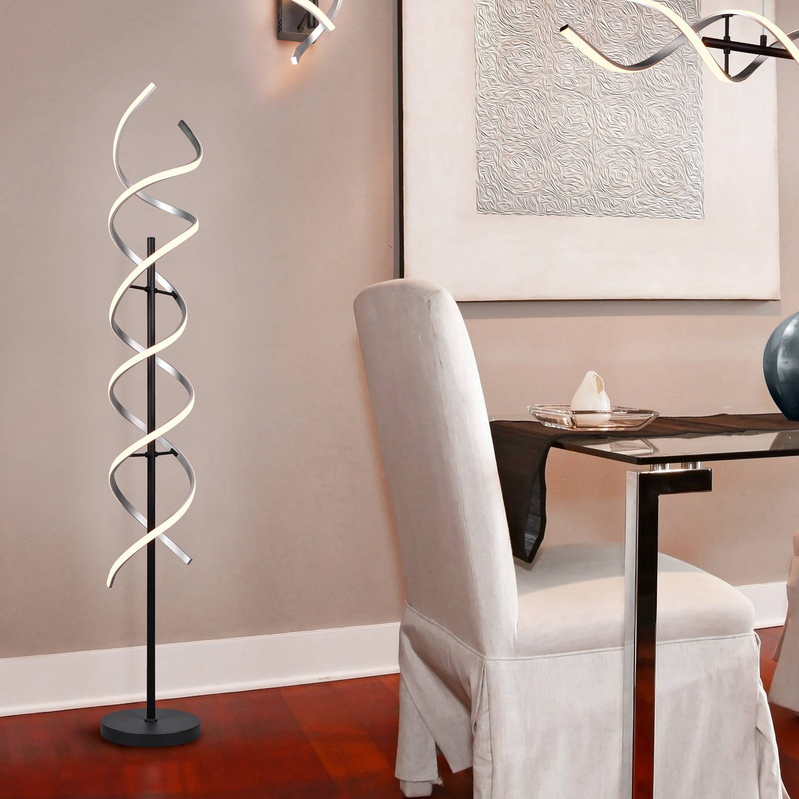 Piantana LED Sequence con dimmer integrato, CCT La piantana LED Sequence, realizzata in alluminio, ha la forma di una spirale. La temperatura di luce può essere impostata tramite un interruttore posto sulla parte superiore della struttura. È possibile scegliere tra due tonalità di bianco caldo (2.300 K / 3.000 K) e una luce bianca neutra (4.000 K). Allo stesso tempo, l'intensità può essere dimmerata in modo continuo tramite l'interruttore.