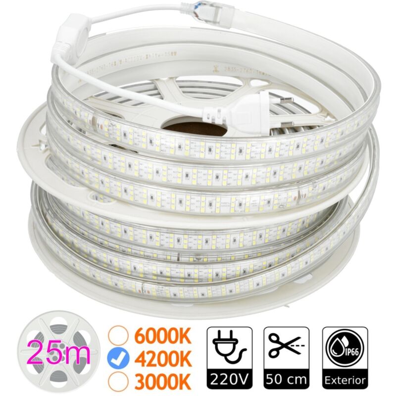 La striscia LED Triple 6000K funziona direttamente a 220-240 V dal rettificatore. Costruita con LED ad alta potenza SMD2835, questa striscia a LED è ideale per strutture industriali, luoghi per il tempo libero, hotel, ristoranti, parchi, motivi di Natale, ecc ... Triple 4200K Strip ad alta potenza Questa striscia a LED ha una grande potenza, raggiunge il 19,8 W per metro . Date le sue caratteristiche, è una striscia a LED che emette molta luce. Il tipo di illuminazione continua e la sua elevata luminosità lo rendono ideale come fonte di decorazione o illuminazione in cui le strisce a LED convenzionali non generano la luce desiderata. Luce bianca naturale 4200k è il tono della luce intermedia per tutti gli scopi. Questa luce offre una sensazione di illuminazione abbastanza forte mentre incorpora un leggero tono giallo oltre a un buon contrasto. È il colore più simile al sole o alla luce del giorno. Perfetto per l'illuminazione della stanza dell'illuminazione, soggiorno, scaffali