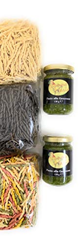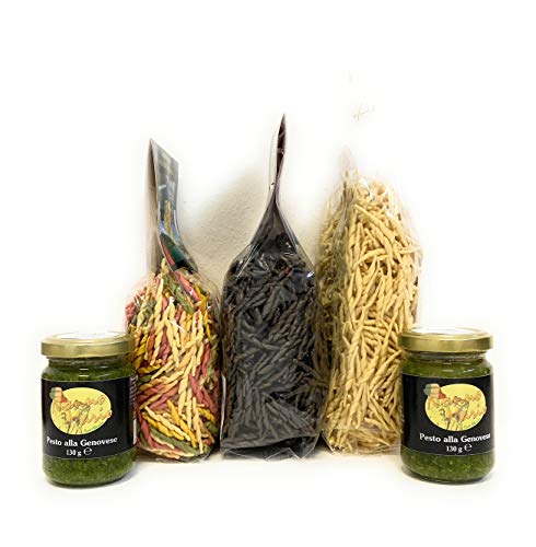 Il pacco contiene: 1 pacchetto di Trofie 5 sapori, prodotte artigianalmente senza conservanti e con coloranti da materie prime naturali: il verde degli spinaci, il rosso del pomodoro, il giallo della curcuma, il bordeaux della barbabietola e il bianco della semola di grano duro) 500gr,