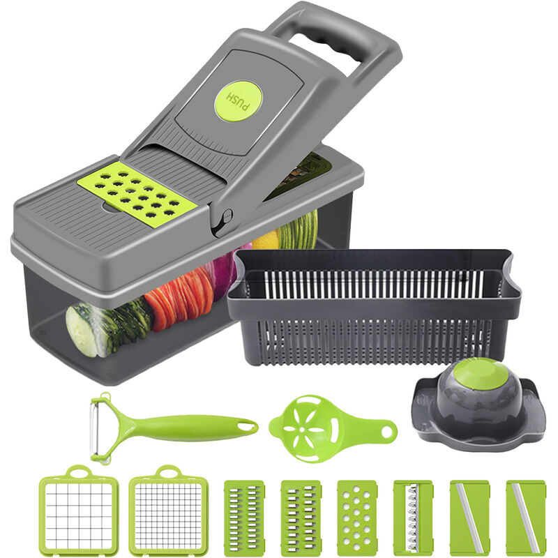 Descrizione: Il tritaverdure multifunzionale 12 in 1 consente di affettare, grattugiare, tagliare a cubetti e tagliare una varietà di frutta e verdura in una varietà di forme e dimensioni facilmente e con flessibilità in un tempo minimo. La base antiscivolo gommata premium garantisce stabilità e sicurezza. Caratteristiche: [Alta qualità] Il tritaverdure è dotato di acciaio inossidabile lame per tagliare/tagliare a cubetti verdure molto dure. [Multifunzione] Con 8 lame intercambiabili e un pelapatate extra, attraverso il quale puoi ottenere fette grandi o piccole, spesse o sottili, brandelli o julienne.< br /> [Design umanizzato] Con cestello di scarico e contenitore, perfetto per le persone impegnate a preparare i pasti. [Protezione per le mani] Con una protezione per le mani per il supporto di sicurezza per proteggere le dita e un coperchio gommato antiscivolo per stabilità e durata. [Ampiamente applicabile]Adatto per cavoli, cipolle, pomodori, aglio, carote, patate, uova, frutta