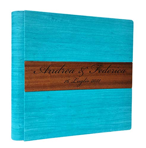 TriVin Art, Album Fotografico in Similpelle pregiato,con Applicazione in Legno Personalizzabile con Incisione.Battesimo,Matrimonio,Comunione e fotoricordi. (Turchese)
