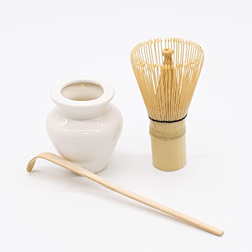 TRIXES Set di frusta da tè verde giapponese Matcha - frusta e cucchiaio/paletta con supporto in ceramica bianca - montalatte biologico e l'accessorio perfetto per la cucina