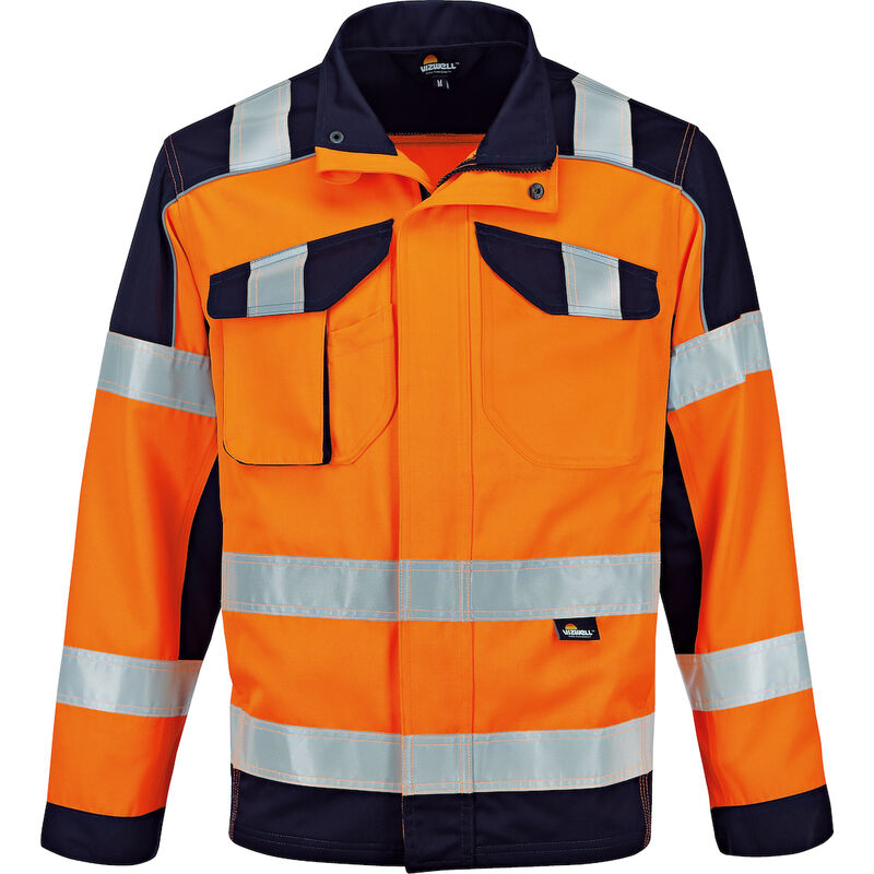 Giacca con cintura 2 strisce riflettenti larghe 5 cm che corrono intorno al busto e alle braccia e 1 x 5 cm ciascuna sulle spalle Patte di chiusura in velcro Cerniera frontale con patta e velcro Polsini con chiusura a bottone Il movimento si piega nella zona posteriore orlo giacca regolabile Inserti a contrasto in blu navy Borse: 2 taschini sul petto, uno con scomparto per penne e uno con tasca nascosta per carte d'identità 2 tasche laterali con ampi taschini 3 grandi tasche interne, di cui una con targhetta caratteristiche tecniche: DIN EN ISO 13688:2013 - Indumenti di protezione - Requisiti generali DIN EN ISO 20471:2013 - Indumenti di avvertenza ad alta visibilità, materiale di base di classe 2 almeno 0,5 m2 materiale retroriflettente almeno 0,13 m2 dati dell'articolo: Articolo n.: VWT112 + Colore + TagliaTaglie: S - 5XL Colore: giallo-navy luminoso (Y), arancio-navy luminoso (O) Materiale: 60% cotone, 40% poliestere Contenuto: 1 pezzo