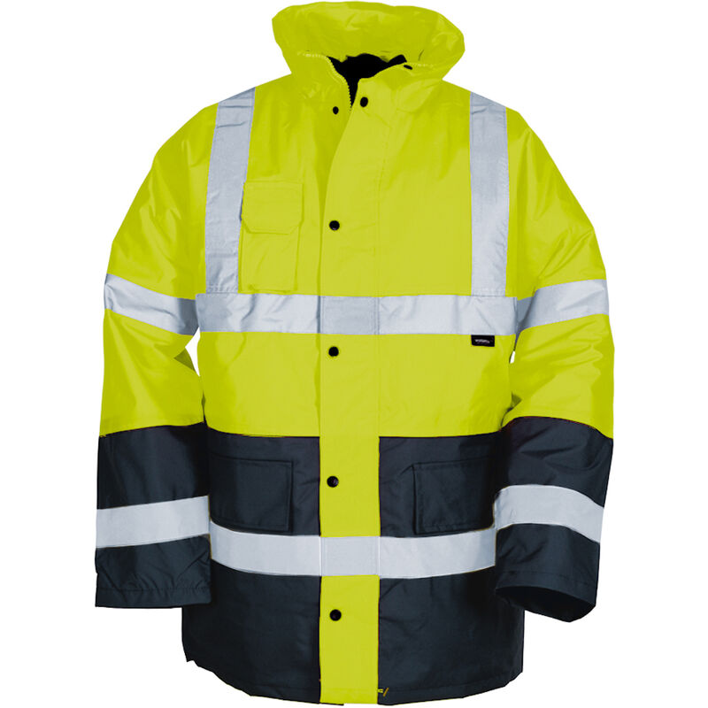 VWJK05 Parka senza PFC 2 strisce riflettenti larghe 5 cm che corrono intorno al busto e alle braccia e 1 x 5 cm ciascuna sulle spalle impermeabile e antivento grazie alle cuciture sigillate Collo con cappuccio integrato Fodera trapuntata con efficace protezione dal freddo Cerniera frontale a 2 vie con abbottonatura e automatici Accesso con zip per la decorazione Inserti a contrasto in blu navy impermeabile: 3000 mm Borse: 2 tasche sui fianchi con patta 1 taschino sul petto/tasca portacellulare con patta e chiusura in velcro 1 tasca interna con chiusura in velcro 1 tasca laterale di sicurezza/tasca Napoleone con zip 1 tasca nascosta per carte d'identità nella tasca laterale sinistra Caratteristiche tecniche: DIN EN 343 - indumenti protettivi - protezione contro la pioggia, classe 3 DIN EN ISO 13688:2013 - Indumenti di protezione - Requisiti generali DIN EN ISO 20471:2013 - Indumenti di avvertenza ad alta visibilità, materiale di base di classe 3 almeno 0,8 m2 materiale